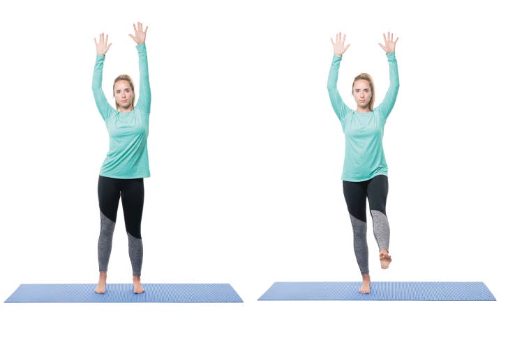 Reach your arms up and allow your weight to shift onto the right leg without bending your knee. Lift your left leg off the ground and drop the left arm to your side. Feel how your head is over your standing foot, where it needs to be for running. Move the other leg around to challenge your balance. Switch sides.
