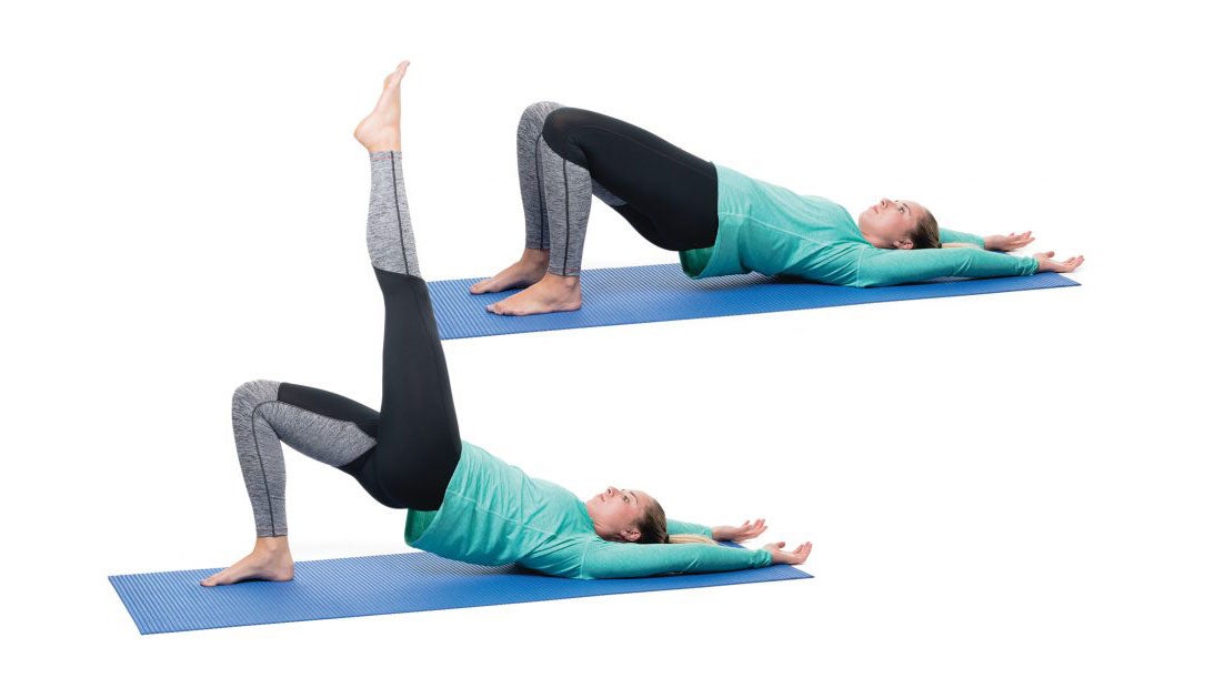 Keep your hips high and in line with each other and lift one leg off the floor. Return it to the floor and repeat with the other leg.