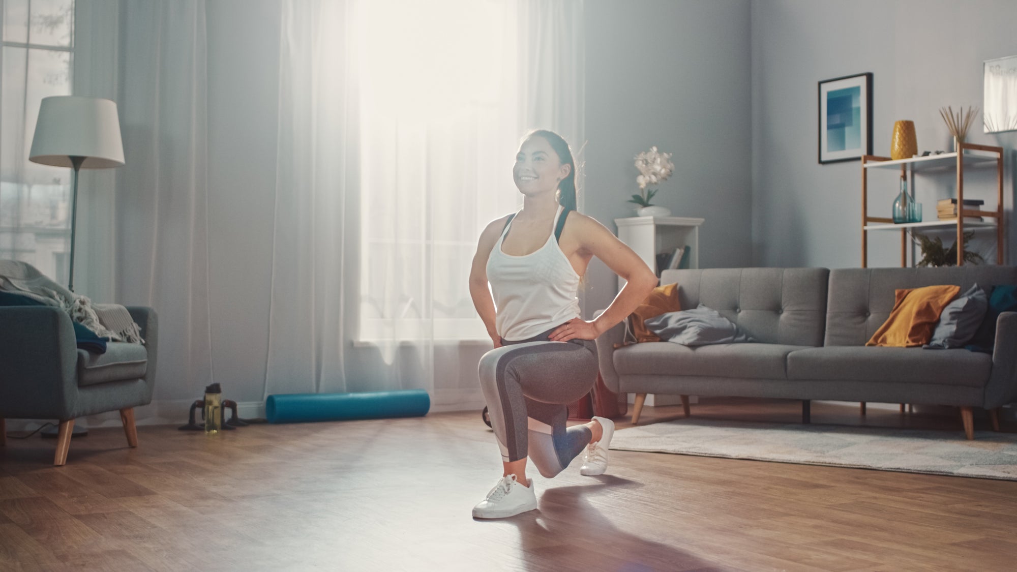 Lateral lunge with single-arm overhead press (with moderate weight if you’d like)