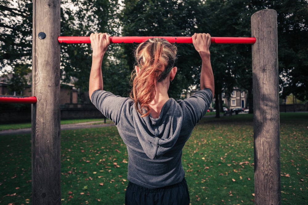 Find a branch or ledge that can support your body weight. Lower your body down and back up.