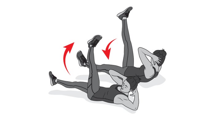 Lie on your back with your head and chest curled off the floor. Place your interlinked palms behind your head for support. Raise one leg straight to ceiling and twist at the obliques to allow your opposite elbow to meet your thigh. Lower your head slightly to come through the center to allow the other elbow to reach the opposite leg.