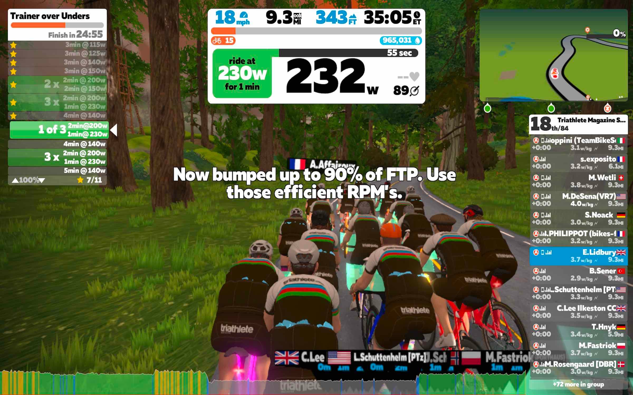 It’s then time to begin the main set: three sets of two minutes at 80% FTP (RPE 7/10) into one minute at 90% FTP (RPE 8/10). After the third time through, you’ll ride easy for four minutes – and be sure to really recover and ride easy here, as you’ll certainly start to feel the cumulative effects of the 80% and 90% FTP work as you progress through the rounds. You’ll repeat this pattern another two times: three sets of two minutes at 80% FTP, one minute at 90% FTP, and then four minutes recovery (riding at 55% of FTP or RPE4-5/10). As you get deeper into the workout, although the efforts aren’t super high intensity, you do start to feel them, and it pays to use your cadence to keep your power smooth and where it needs to be (versus just trying to stomp power through your pedals).