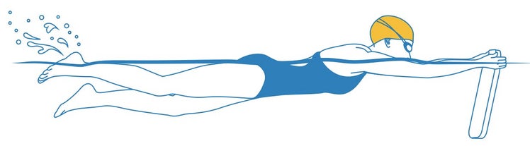 Develop a strong kick by pushing a large surface through the water. Grasp the sides of a kickboard and hold it vertical with only the top inch of the board out of the water. Push off the wall and kick the length of the pool. Keep your body flat and your face in the water except to breathe.