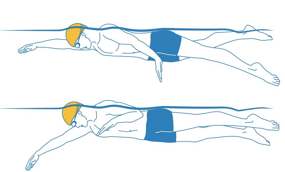 A key element to efficient swimming is learning how to slip through the water. To practice finding the smoothest path, swim the freestyle stroke but keep your hands and arms underwater during the recovery. Don’t lift your hand out of the water after it passes your hip. Instead, slide it up the side of your body, keeping your arms and elbows tucked in close. Move your hand forward into the reach position and then start another stroke.